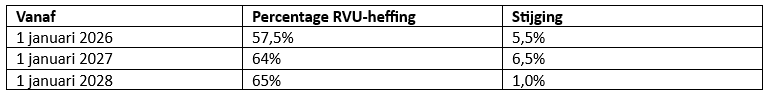 In het Belastingplan 2026 is een - reeds in mei 2025 - aangekondigde verhoging van het RVU-tarief uitgewerkt. Het tarief van 52% gaat in 2027 al naar 64% en is 65% per 2028.